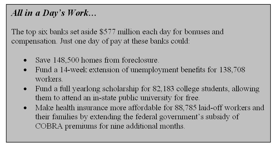 The massive windfall for bankers comes straight out of taxpayers’ pockets. Yet while bankers use taxpayer assistance to enrich themselves instead of jumpstarting the economy by lending, federal, state, and local governments struggle to find the resources to clean up the banks’ mess, protect services, and create jobs.